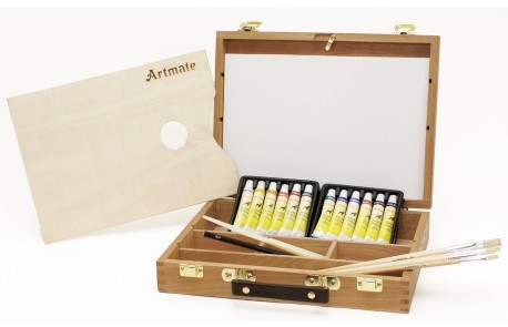 Maletín de madera con todo lo básico para la iniciación a la pintura. Cinco compartimentos.
