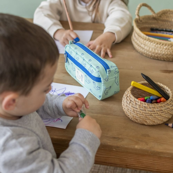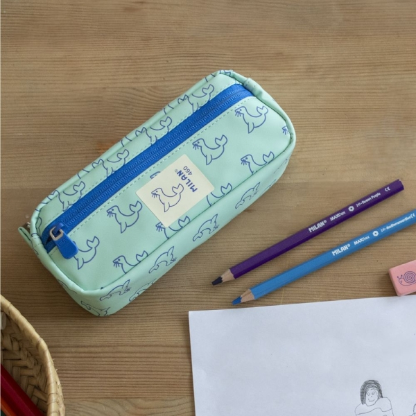 Estuche portatodo rectangular con 2 cremalleras. Color verde con estampado de focas en color azul marino. Colección 460 since 1918, inspirada en los colores y diseño originales de las gomas de borrar MILAN, fabricadas en España desde 1918.