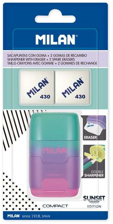 Combinación de goma de borrar y sacapuntas doble (uno estándar y otro MAXI) con depósito. Diseño COMPACT serie Sunset. Goma cuadrada suave de caucho sintético tipo 'miga de pan'. El sacapuntas dispone de una cuchilla de acero afilada y resistente, ideal para todo tipo de lápices. Sacapuntas con cuchilla de seguridad: este sistema evita que se pueda separar la hoja del cuerpo del sacapuntas. Diseño original creado por el departamento de I+D de MILAN. Incluye 2 gomas de borrar 430 de recambio.