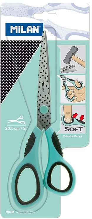 Tijeras oficina con cuchilla de acero inoxidable, hoja con estampado a topos Dots & Buttons. Mango de plástico turquesa con detalles negros, resistente a los golpes y ergonómico.