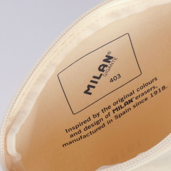 Bolsa de mano de color beige ideal para llevar llaves, pasaporte y pequeños objetos. También puede utilizarse como pequeño bolso o neceser para maquillaje. Dispone de un único compartimento y el cierre es mediante cremallera. Logotipo de la colección de color azul marino. La colección 403 MILAN GIGANTE since 1918 está inspirada en los colores y diseño originales de las gomas de borrar MILAN, fabricadas en España desde 1918.