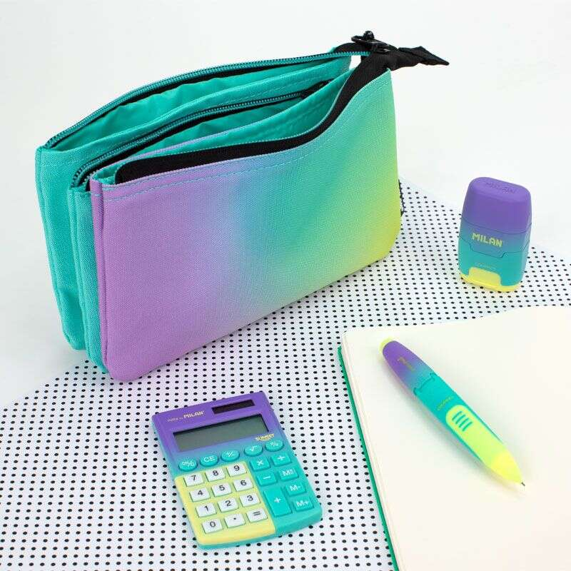 Estuche portatodo con 2 cremalleras y 5 compartimentos, para poder organizar y repartir el contenido Serie Sunset. Una combinación de colores degradados inspirados en el atardecer, acompañados de detalles en blanco y negro. Tiradores de las cremalleras con cuerda. Tejido exterior 'ripstop': ligero y resistente a la rotura y rasgaduras. Utiliza una técnica especial que teje hilos gruesos de refuerzo a intervalos regulares en un patrón entrecruzado.