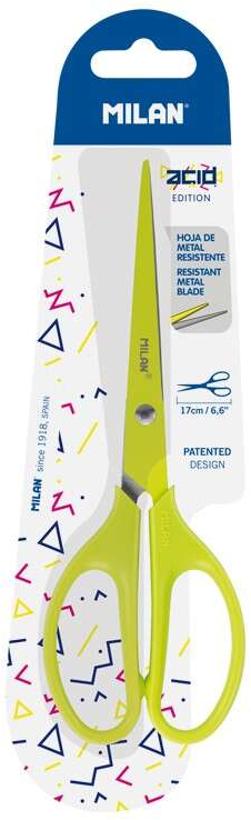 Tijeras de oficina con la hoja del mismo color que la empuñadura. Edición ACID, color amarillo. Con cuchilla de acero inoxidable resistente acabada en punta, que permite una mayor precisión en el corte. Mango de plástico simétrico, apto también para zurdos.