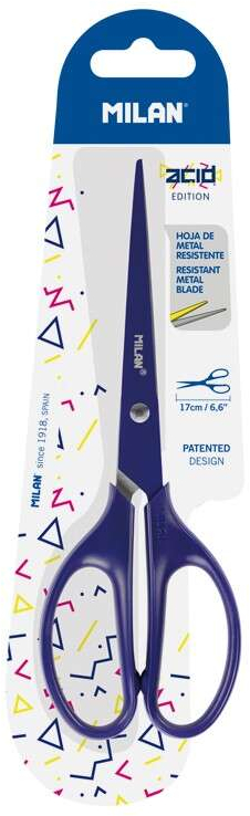 Tijeras de oficina con la hoja del mismo color que la empuñadura. Edición ACID, color azul. Con cuchilla de acero inoxidable resistente acabada en punta, que permite una mayor precisión en el corte. Mango de plástico simétrico, apto también para zurdos.