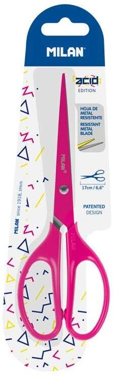 Tijeras de oficina con la hoja del mismo color que la empuñadura. Edición ACID, color rosa. Con cuchilla de acero inoxidable resistente acabada en punta, que permite una mayor precisión en el corte. Mango de plástico simétrico, apto también para zurdos.