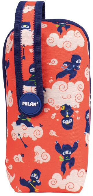 Kit 4 estuches con contenido, que permite mantener el material escolar siempre ordenado y de fácil acceso. Los 4 estuches interiores se pueden extraer y volver a colocar con el velcro. Serie especial Ninjutsu, silenciosos y divertidos ninjas saltan sobre las nubes. Diseño estampado sobre un fondo de color rojo con nubes de color crema y detalles en azul marino. Forro interior en color azul marino con dibujos de pequeñas estrellas shuriken.