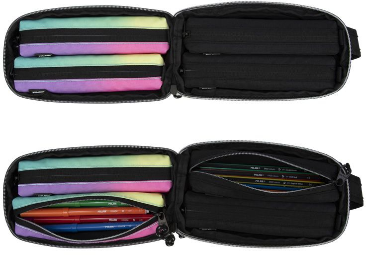 Kit con 4 estuches rellenos que te permite tener el material escolar siempre ordenado y de fácil acceso. Las 4 fundas interiores se pueden quitar y volver a colocar gracias al velcro. Serie Sunset, color negro. Una combinación de colores degradados inspirados en la puesta de sol, con detalles en blanco y negro. Tirador de cremallera con cordón. Con 2 estuches interiores negros y 2 de colores degradados.