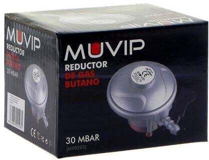 Muvip Reductor de Gas Butano 30mbar Especificaciones: -Uso para bombona butano / propano -Presión de salida: 30mbar -Boquilla para manguera de 8mm de diámetro -Conexión de entrada de 20mm