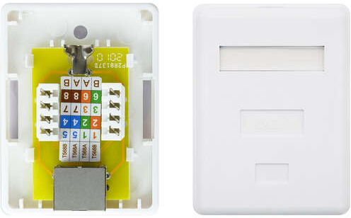 Roseta de superficie con una toma para conexión RJ45 cat.6 UTP. Especificaciones: -Color: Blanco -Normativas: RoHS -Test de Funcionamiento: 100% testado