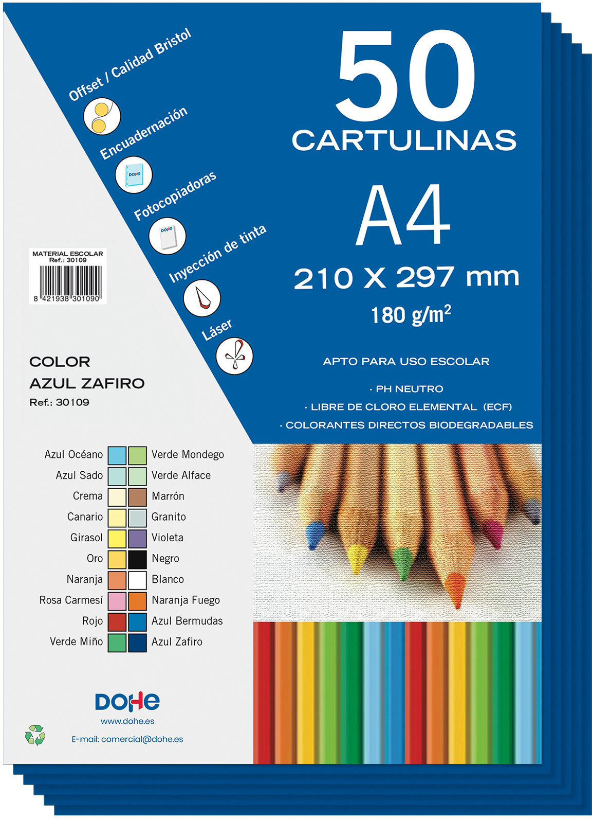 Cartulinas de colores de 180 g/m2. Aptas para uso escolar, con PH neutro, libres de cloro elemental (ECF y con colorantes directos biodegradables. Paquete de 50 cartulinas tamaño A4.