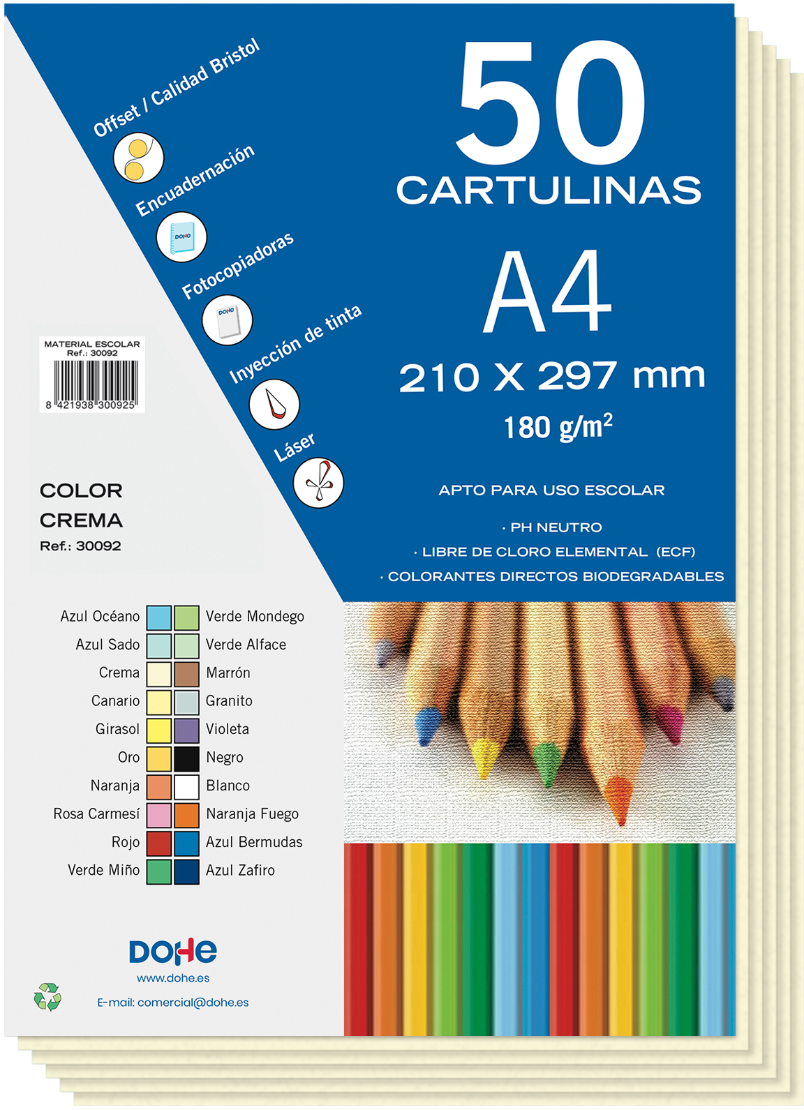 Cartulinas de colores de 180 g/m2. Aptas para uso escolar, con PH neutro, libres de cloro elemental (ECF y con colorantes directos biodegradables. Paquete de 50 cartulinas tamaño A4.