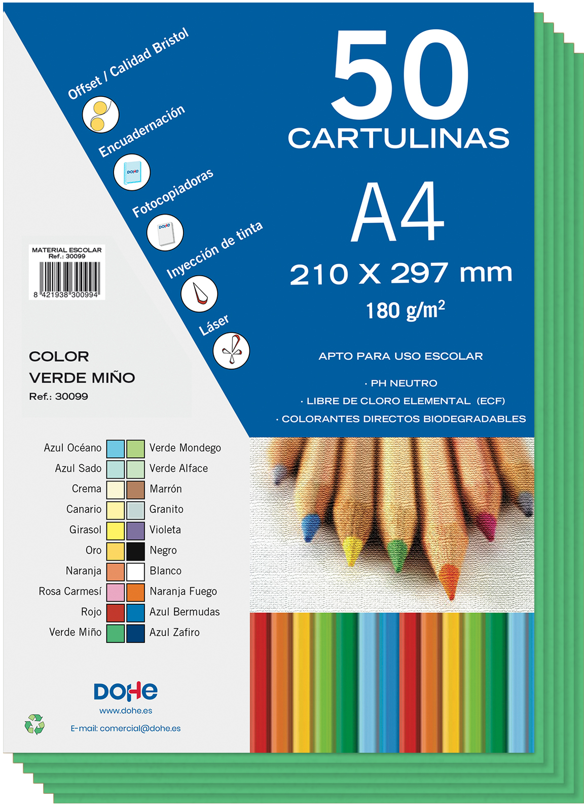 Cartulinas de colores de 180 g/m2. Aptas para uso escolar, con PH neutro, libres de cloro elemental (ECF y con colorantes directos biodegradables. Paquete de 50 cartulinas tamaño A4.
