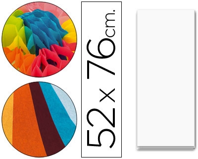 Gramaje:18 g m2. Papel de seda, coloreado en masa, presentado en paquetes de 25 hojas. Aplicación: Manualidades, decoración, etc. Medida de la hoja:52 x 76 cm.