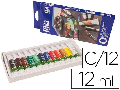 En caja de cartón. Tubos de 12 ml.12 colores surtidos. Pintar al óleo escubrir con pintura al aceite una superficie de tela, madera, cartón, papel u otro material.