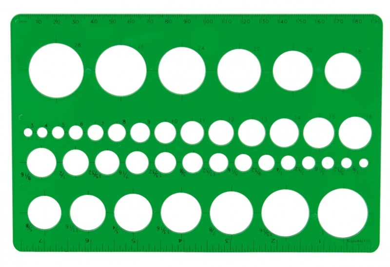 Plantillas para diferentes formatos de círculos, de 1 a 35 mm. Plástico. Color verde.