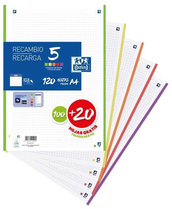 Recambio OXFORD retractilado en paquete de 120 Hojas con 5 colores de banda vivos y 4 taladros de archivo para poder guardar las hojas en un archivador o carpeta de anillas. Ideal para quienes prefieren hojas sueltas y llevar sólo las que necesiten. Puedes organizarte para utilizar un color por asignatura o tema. Compatible con la app gratuita SCRIBZEE que permite organizar, consultar, compartir y acceder a tus notas en cualquier lugar desde tu Smartphone, tablet o PC.