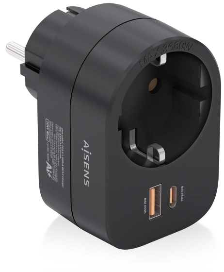 - Regleta de pared multifunción con 1 toma Schuko, 1 puerto USB-C de 20W PD3.0 y 1 puerto USB-A de 20W QC3.0.