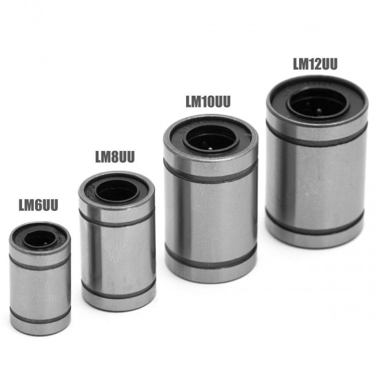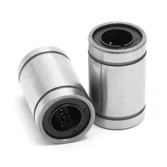Rodamientos LM8UU estándar, son los usados en las impresoras reprap para el movimiento lineal usando varillas lisas de 8 milímetros, según el número de rodamientos usados en cada eje podrás necesitar entre 10 unidades (3 en Y, 3 en X y 4 en Z) hasta 12 (4 en XYZ).