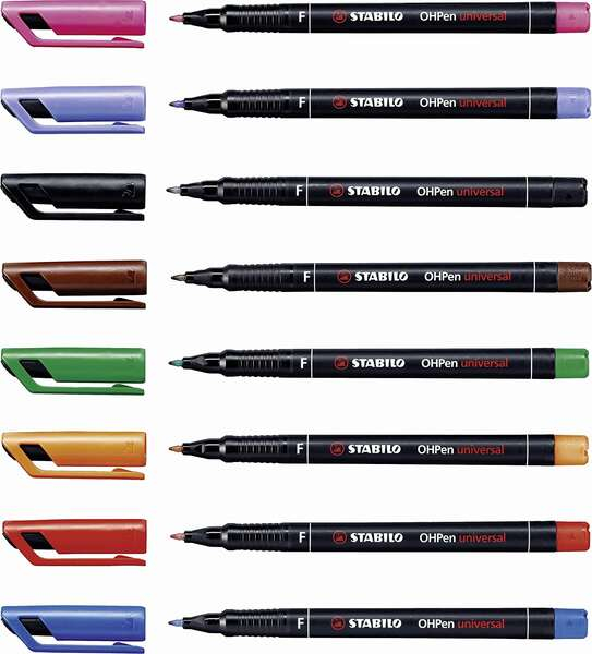 El marcador permanente STABILO OHPen universal escribe en casi cualquier superficie dura, por lo que es perfecto para cualquier tarea. Con tres anchos de línea, puede estar sin tapón hasta 3 días y dispone de 2 tipos de tinta: soluble en agua o permanente. Desde la escritura más fina hasta el marcado claro, todo dentro de un estándar profesional.