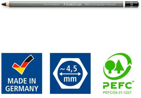 Lápiz carboncillo de alta calidad. Formulación especial con una alta proporción de grafito y carbón para una amplia gama de tonos negros extremadamente intensos y profundos. Diámetro de mina 4,5 mm aprox. Lápices ecológicos, con madera con certificación PEFC, procedente de bosques de gestión sostenible.