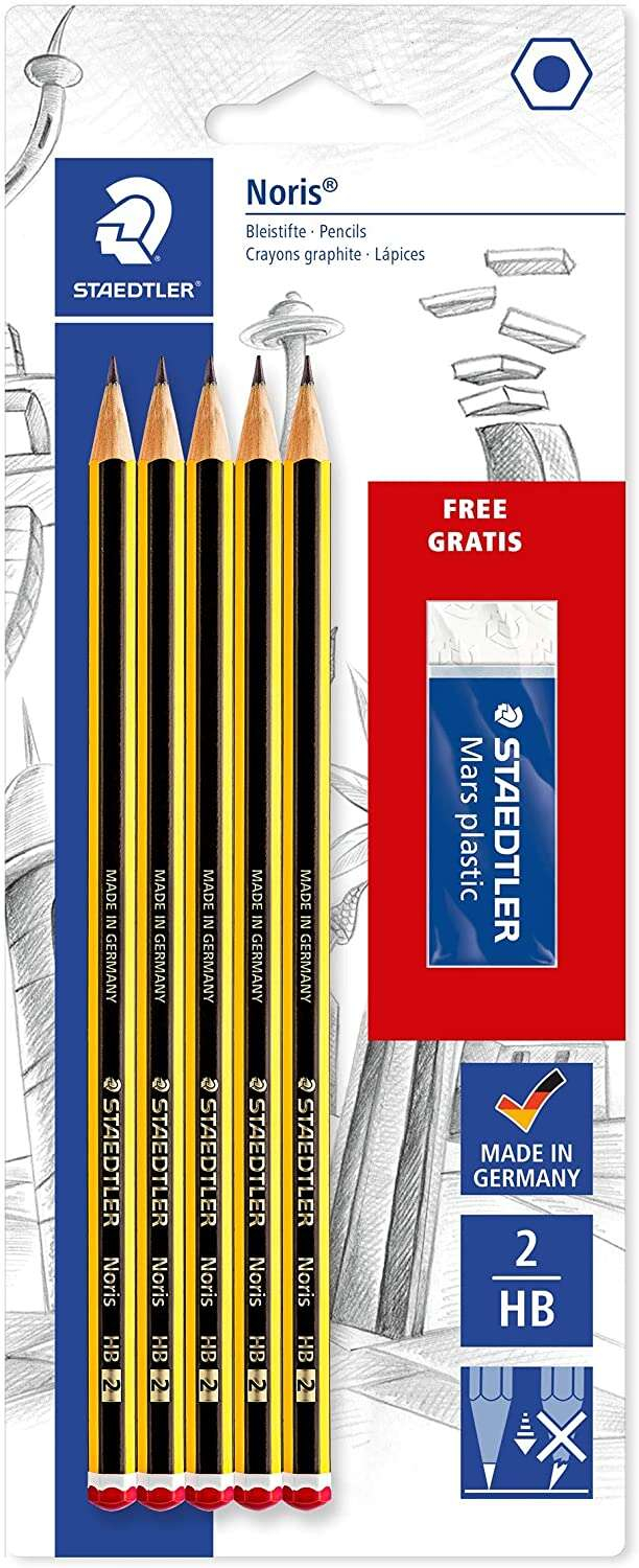 5 Noris nº 2 + goma Mars Plastic gratis. Características: -Un blíster con 5 lápices. -Dureza: HB. -Incluye goma. -Madera certificada, procedente de bosques de gestión sostenible.