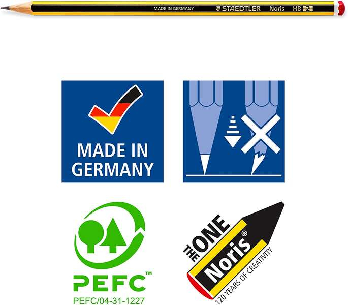 -Dureza HB, increíblemente resistente a la rotura gracias a la fórmula especial de la mina y a las minas encoladas, madera procedente de bosques de gestión sostenible.