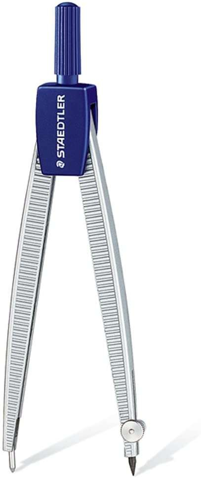 Compás escolar de precisión con obtusángulo y aguja roma a prueba de lesiones, para la iniciación al dibujo, diámetro máximo del círculo 300 mm. Estuche de plástico con tapa transparente abatible con borde en forma de regla de 130 mm, con: compás, tubo de minas y adaptador universal.