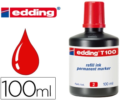 Tinta permanente casi inodora. Sirve para rellenar todo tipo de marcadoresrecargables y permanentes Edding. Frasco de 100 ml. Color rojo.