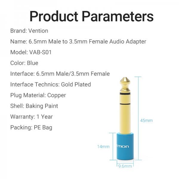 Vention Adaptador Jack 6.5 Macho a Jack 3.5 Hembra Especificaciones: -Color: Azul -Tipo de Interfaz: 6.5 Macho, 3.5 Hembra -Proceso de Interfaz: Gold Plated -Material: Bronce