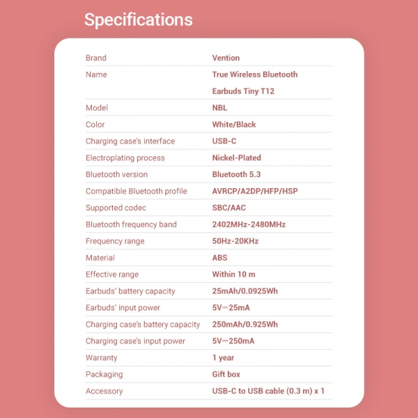 Vention Auriculares Bluetooth 5.3 con Estuche de Carga - 6h Autonomia - Tiny T12
