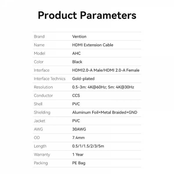 -Cable de vídeo Vention HDMI 2.0 Extensión 4K HD Cable PVC Tipo 1M Negro conecta el dispositivo reproduciendo la imagen.