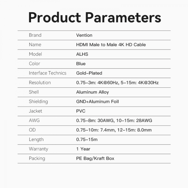 Vention Cable HDMI Macho a HDMI Macho 2.0 4K - 0.75m Especificaciones: -Interfaz versión: HDMI 2.0 -Resolución: 4K@60Hz -30AWG -Longitud: 0.75m -Color: azul -Material: PVC