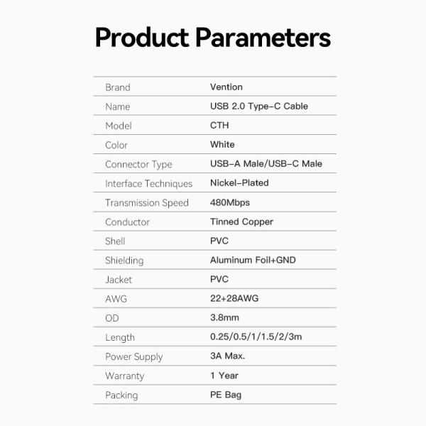 Más información sobre Vention Cable USB-A Macho a USB-C Macho - 1.5m - 3A - 60W - 480Mbps - Blanco