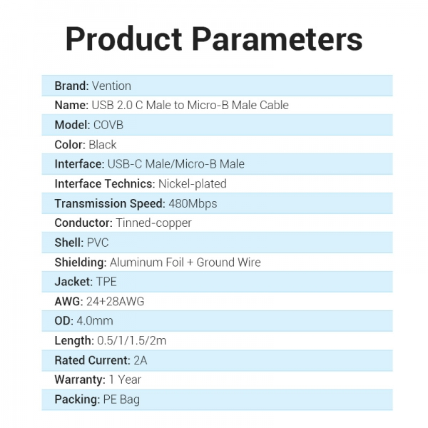 Más información sobre Vention Cable USB-C Macho a MicroUSB Macho - 50cm - 2A 10W 480Mbps - Negro