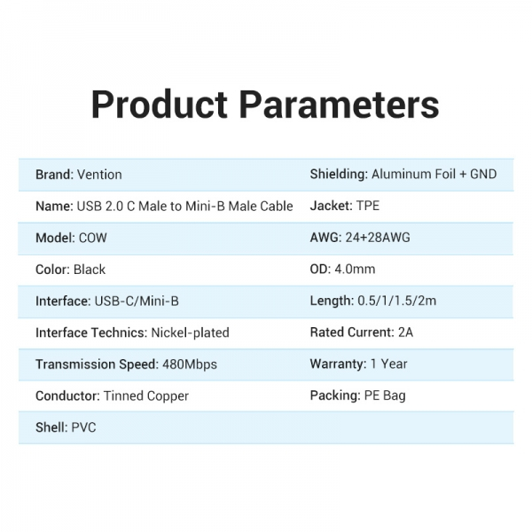Vention Cable USB-C Macho a MiniUSB Macho - 1.5m Especificaciones: -Interfaz: USB 2.0 -Conectores: USB-C, USB Mini-B macho -Longitud del cable: 1.5 m -Trenzado de cable de datos: trenzado común -Color: negro