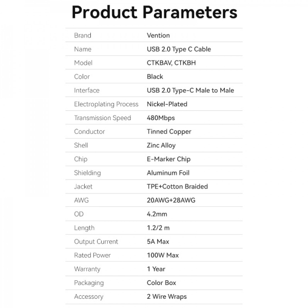 Más información sobre Vention Cable USB-C Macho a USB-C Macho - 2m - 5A - PD100W - Negro